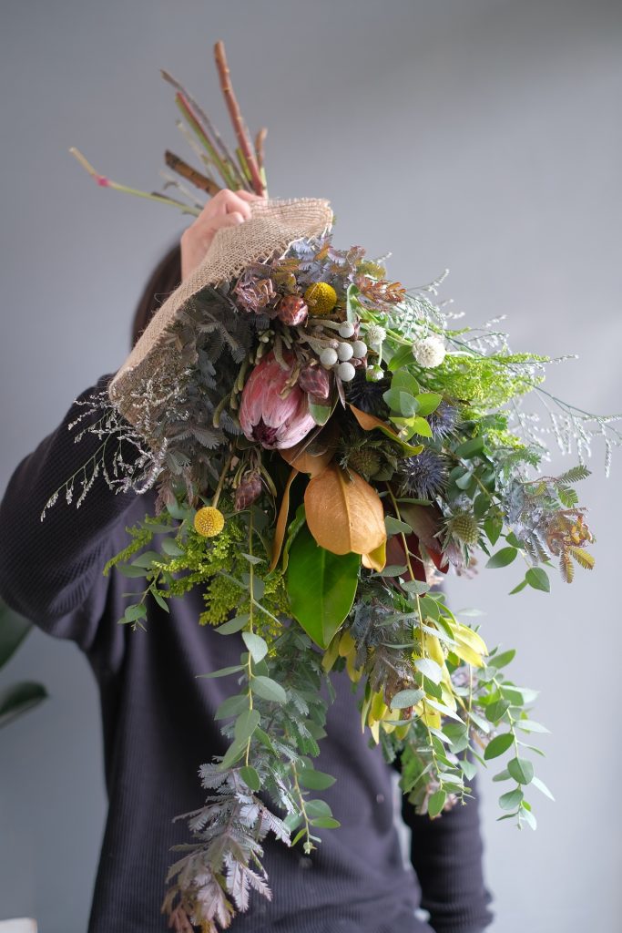 その季節に出荷がある花材をセレクトしてスワッグを制作。